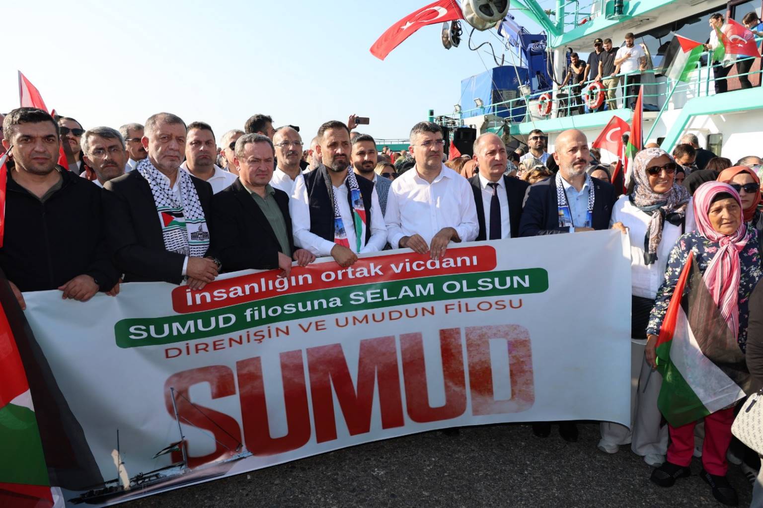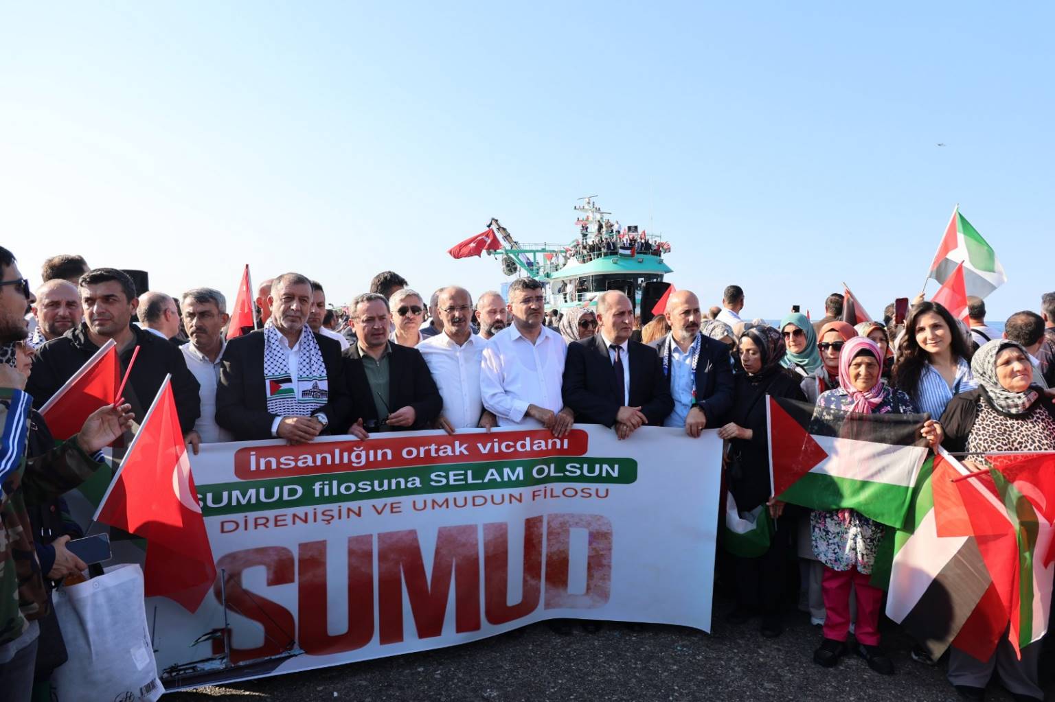 Arhavi, Hopa ve Kemalpaşa balıkçı barınaklarından hareket eden balıkçı tekneleri ve özel botlar, Türk ve Filistin bayraklarıyla donatılarak Hopa İskelesi’ne ulaştı. Arhavi Belediye Başkanımız Turgay Ataselim, AK Parti Arhavi İlçe Başkanı Maksut Çorbacı ile birlikte teknelerle Hopa İskelesi’ne giderek destek konvoyuna katıldı. İskelede toplanan kalabalık grup, sloganlar konvoyu karşıladı. Alan kısa sürede miting alanına dönüşürken, dayanışma mesajlarıyla Filistin’e destek çağrıları yapıldı.