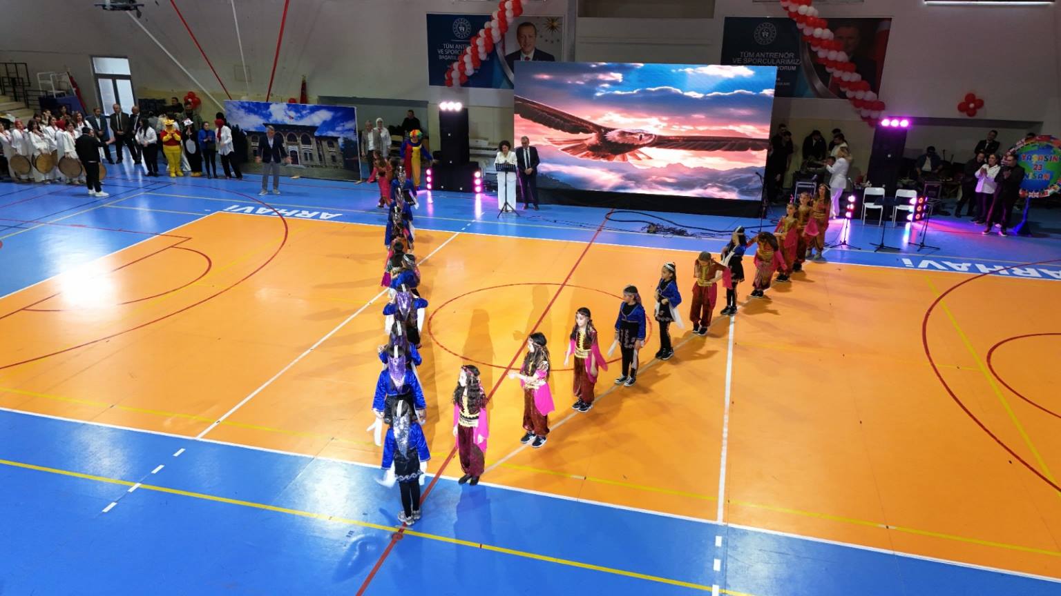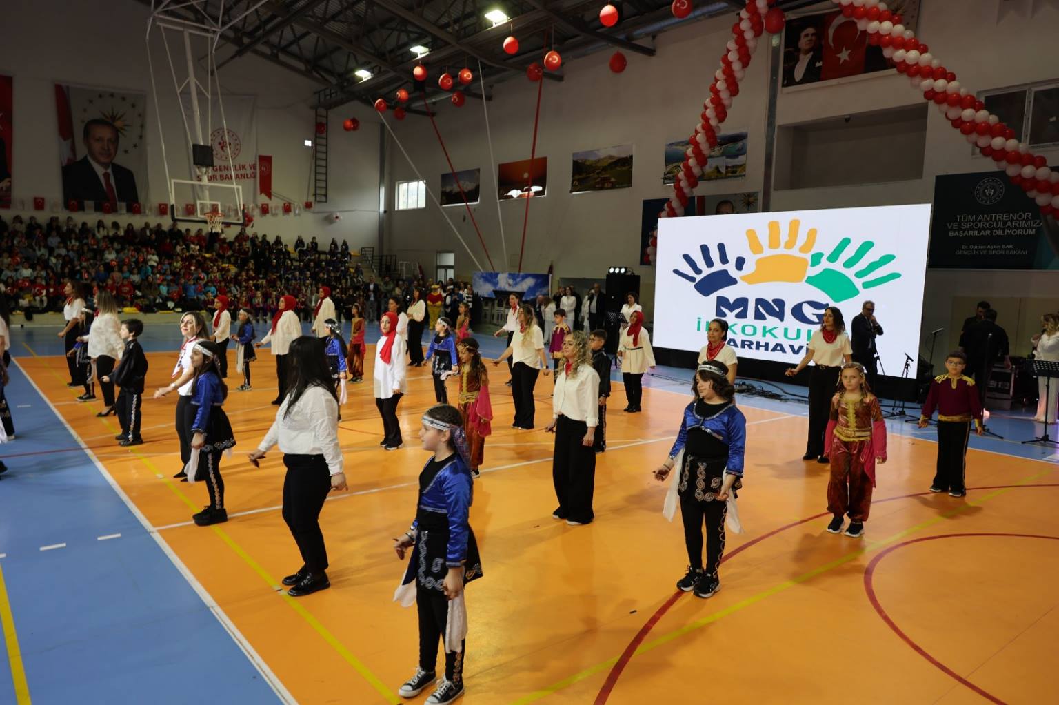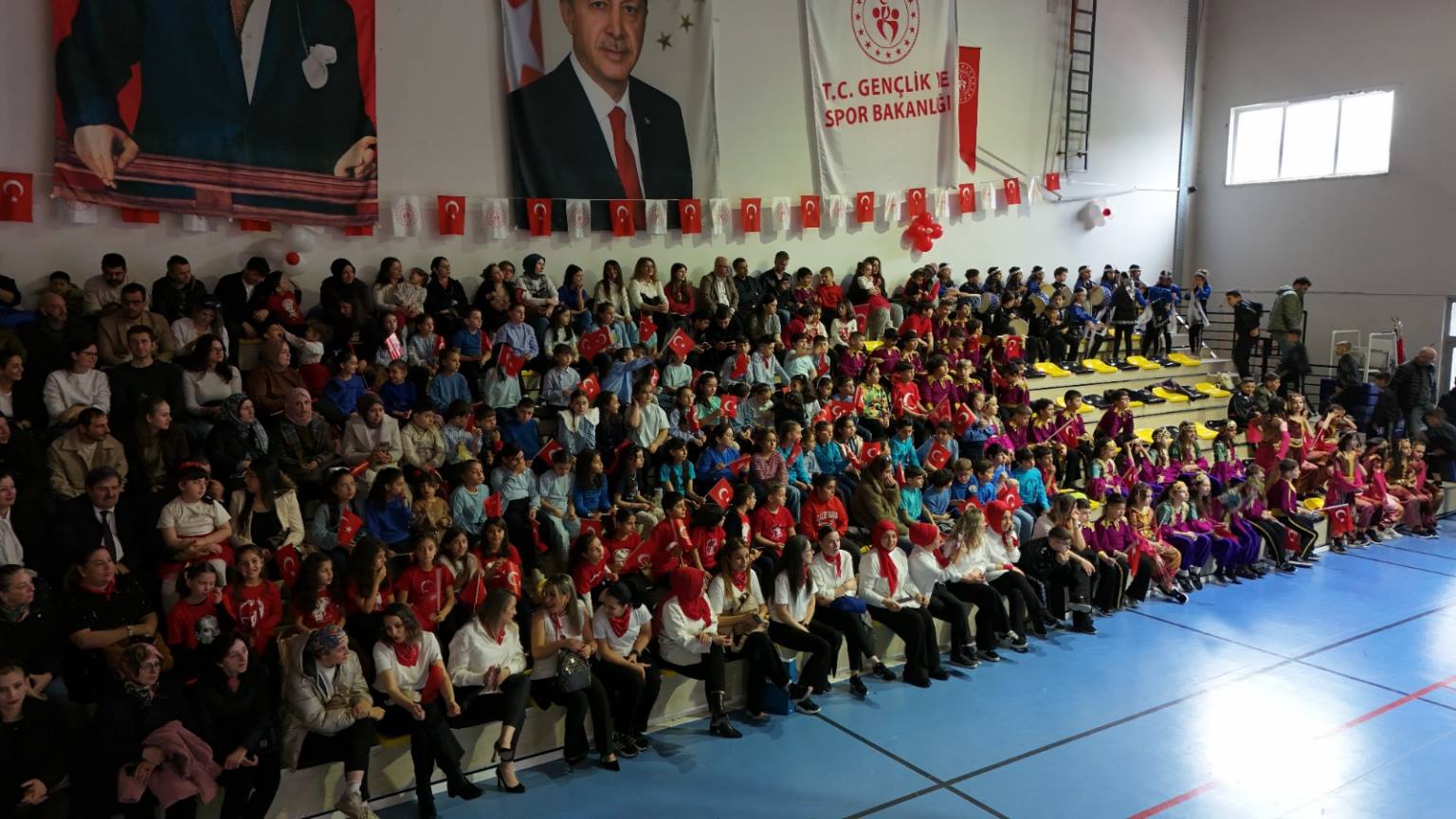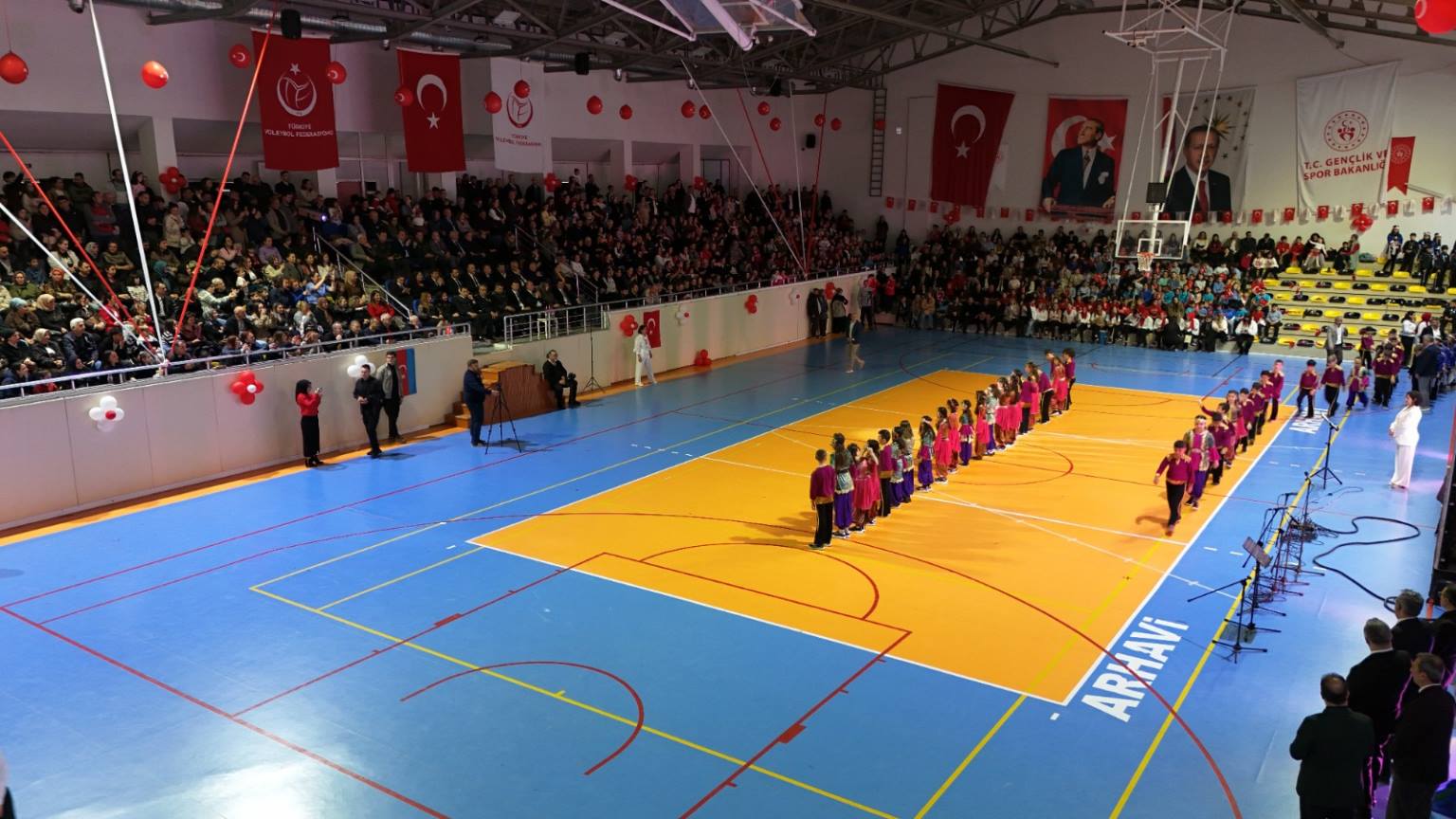 Programın ikinci bölümü ise ilçe kapalı spor salonunda gerçekleştirildi. Yoğun katılımın olduğu salonda, saygı duruşu ve İstiklal Marşı’nın ardından İlçe Kaymakamı Burak Çimşir ve Belediye Başkanı Turgay Ataselim, tüm katılımcıların bayramını kutladı. İlçe Milli Eğitim Müdürü Aytaç Akgümüş’ün konuşmasının ardından öğrenciler, birbirinden renkli gösterilerle sahne aldı. Mehmet Nazif Günal İlkokulu öğrencileri, velileri ve öğretmenleri ile kardeş okul Tunçkaya İlkokulu öğrencileri tarafından hazırlanan gösteriler izleyenlere unutulmaz anlar yaşattı. Turan Manafzade’nin müzik dinletisi ise bayram coşkusuna ayrı bir renk kattı.